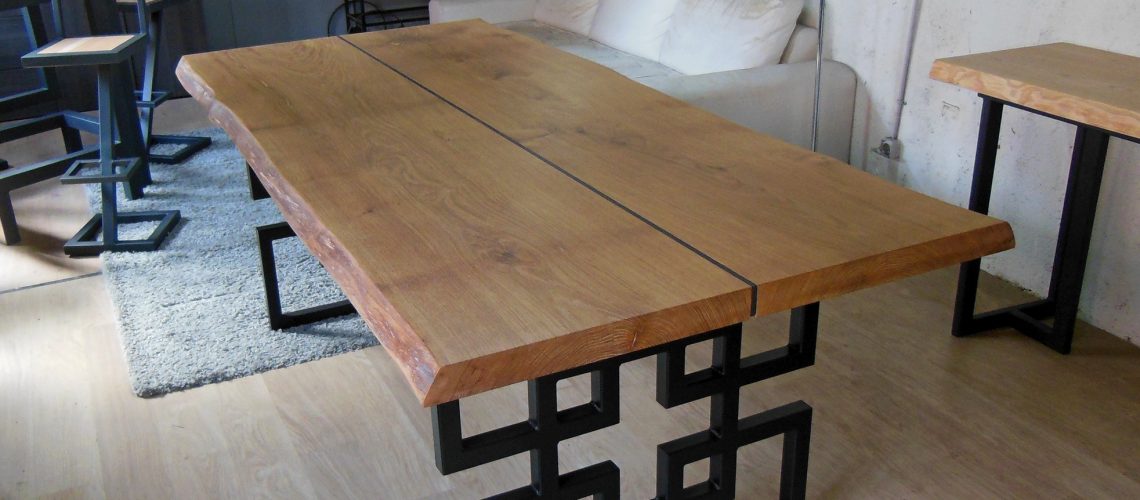 Table à manger. Plateau « Tranche d’Arbre » en Chêne avec soupçon de Wengé. Structure en acier laqué noir.